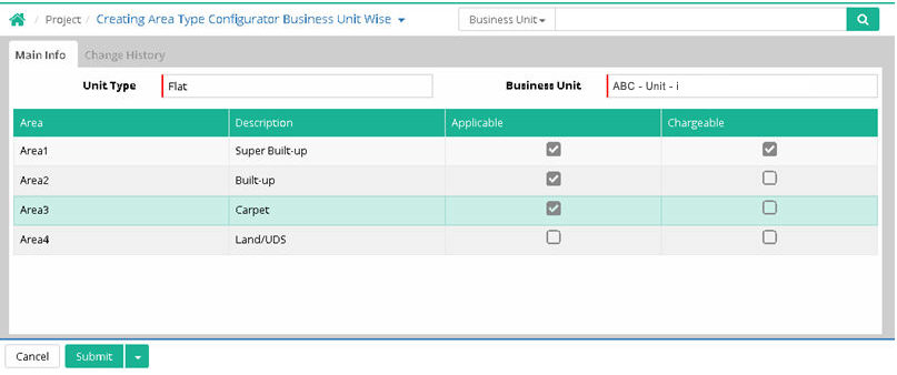 After configuring the area descriptions, the Chargeable and Applicable fields selected in the Area Type Configurator Business Unit-wise will be reflected in the Unit Master when creating a unit.
