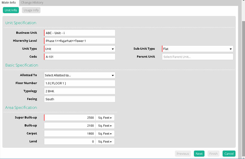 Unit setup is used to ascertain the Built-up area based on inserted information regarding unit type, sub-unit type, floor, typology of the project. Different areas of a unit and other unit attributes of a particular business model type are captured here.