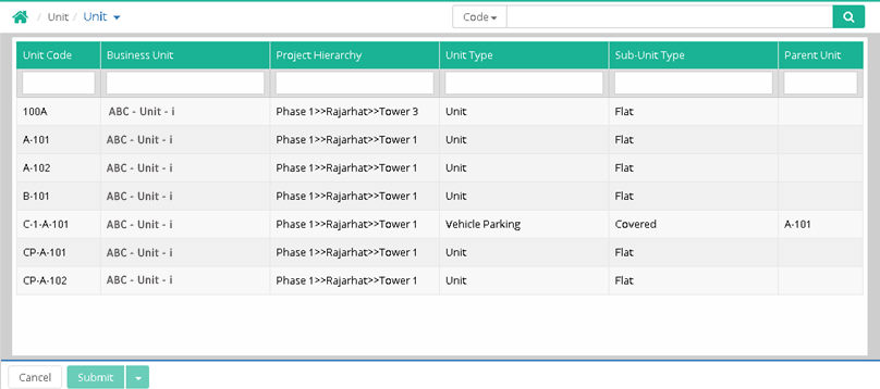 Parent Unit: Select parent unit if required. Parent unit concept can be implemented if one unit is having car parking, servant quarter, terrace, garden, etc. and all these are created as unit master under a parent unit