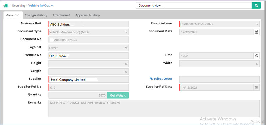 3. Once the Farvision user will click on the Get Weight option in Farvision Vehicle in/out option, this will initiate the API calling & same will check the latest available data in TFA_WEIGHBRIDGEDATA table & reflect the Quantity data in Farvision.