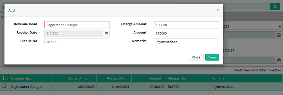 Charge Amount: Enter amount due against the selected Revenue Head