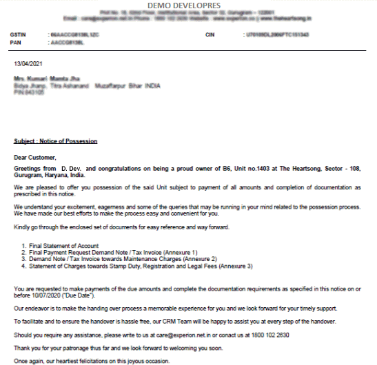 Sample Offer of Possession