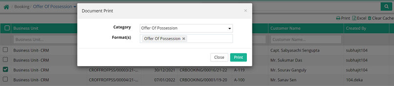 Customer: Select the customer whose offer for possession is to be processed. Customer Unit information and Booking number will be displayed