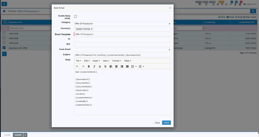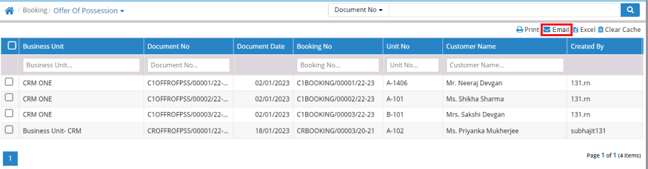 Users will be able to send email against offer of Possession entry.