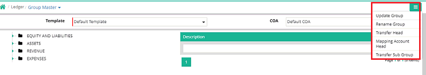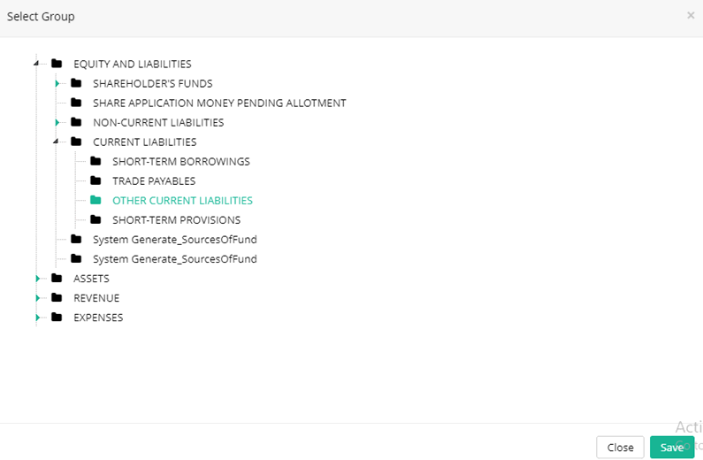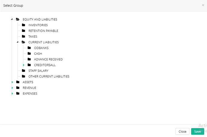 Click on the ledger grid which needs to be mapped. A popup window will open. Here group needs to be selected. After selection click Save.