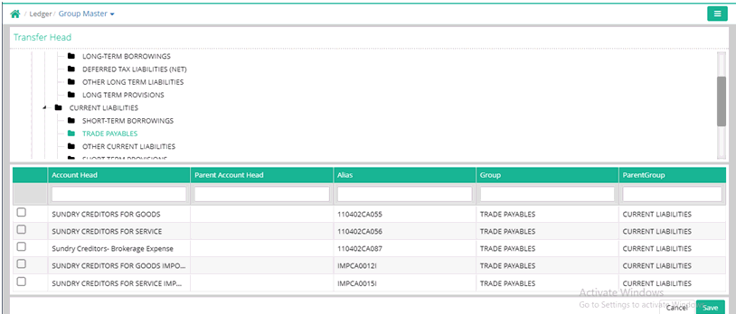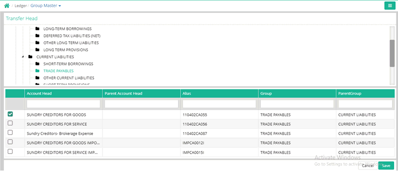 A popup window will open. Select the group where ledger will be transferred. Click Save.