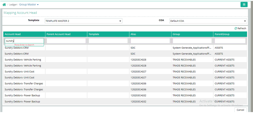 After clicking on the Mapping Account Head, ledger will be shown which is to be tagged for default template (if any). Select the Template and corresponding COA for which mapping will be done.