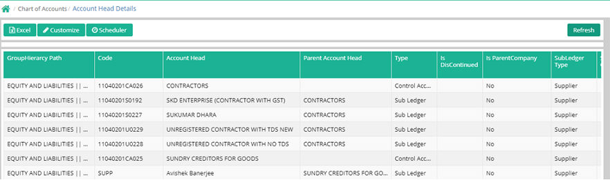 | GroupHierarcy Path | Code | Account Head | Parent Account Head | Type | Is DisContinued | DisContinued Remark | Is ParentCompany | SubLedger Type | Subledger Category | Subledger SubState | Address Type | AccountHead Address | Account Name | Account No | IFSC Code | Swift Code | Bank Address | Contact Name | Contact Email | Proprietor Name | Contact PhoneNo | Communication | Tds DeductionType | Company Status | Other Company Status | PAN | Msme Type | Msme No | Pf No | Esi No | Ledger Gstin | TDS Nature | Bank AccountNo | Is FCNRBank | Foreign Currency | Is Negative Balance Check | Template Description | Group Description | Coa Description | Created Date | Last Modified Date |